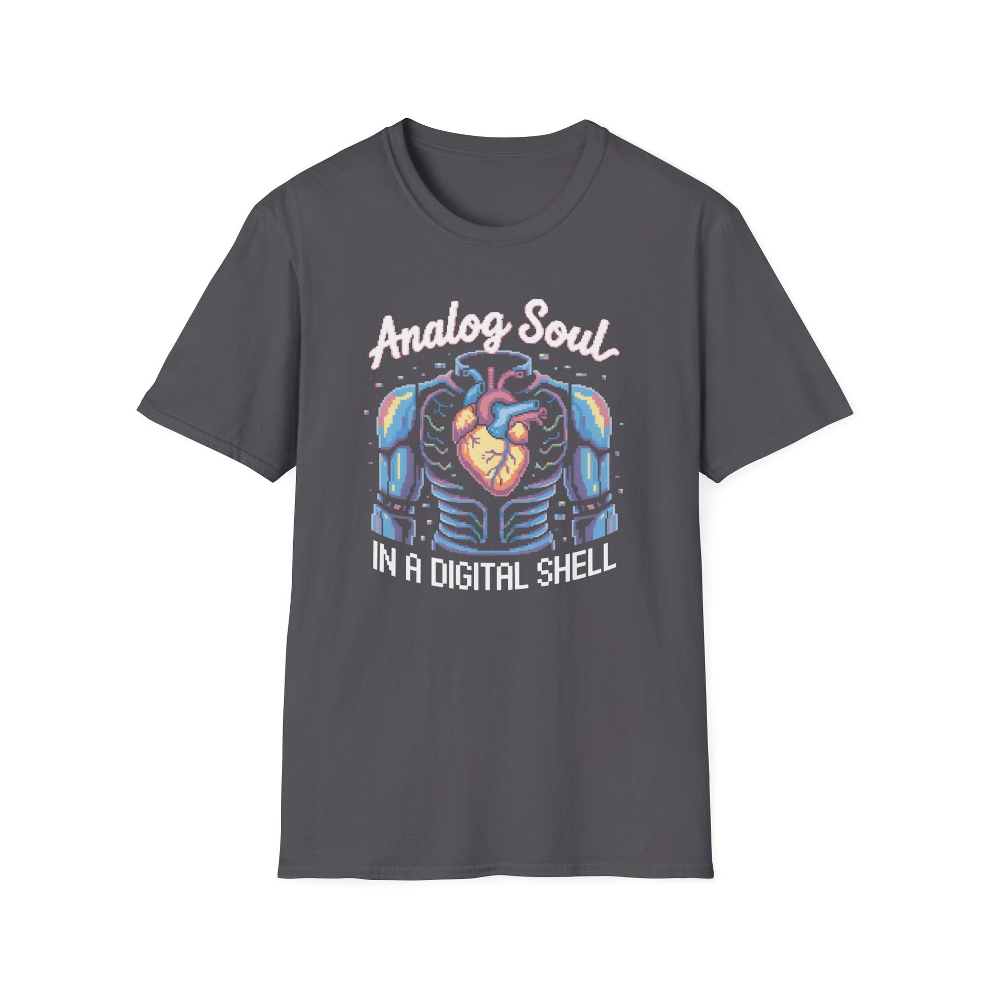 This tee captures that feeling perfectly: a pixel-art cyborg chest cracked open to reveal a real human heart, glowing with color and detail. “Analog Soul in a Digital Shell” hits for anyone who lives in both worlds — creative, techie, nostalgic, and human at the core.